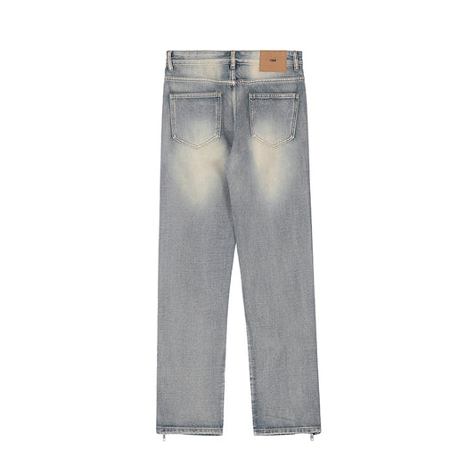 High Street Side Zipper Ripped Jeans Retro Washed Trendy Slim Fit