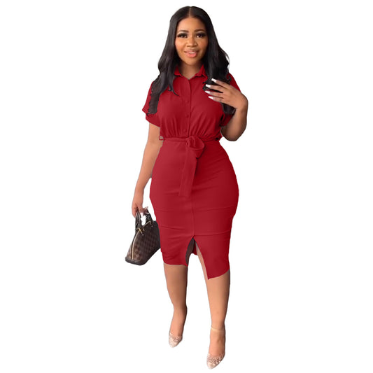 Spring And Summer Short Sleeve Split Shirt Dress With Belt