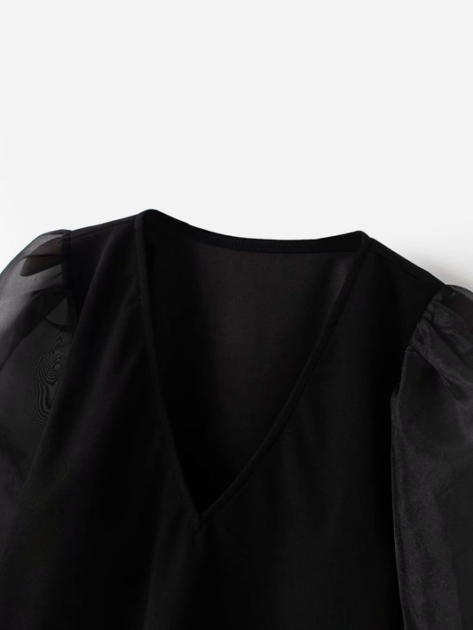 Mesh Stitching T-Shirt Women Straight Puff Sleeve British Women's Clothing