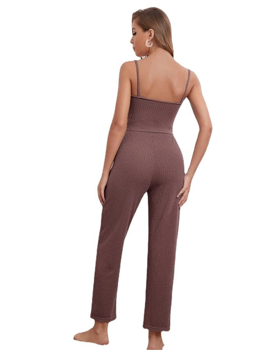 Waffle Knitted Suspenders Top And Trousers Robe Pajamas Three-piece Suit