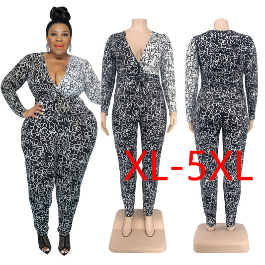 Fashion Digital Printing V-Neck Women's Jumpsuit Long