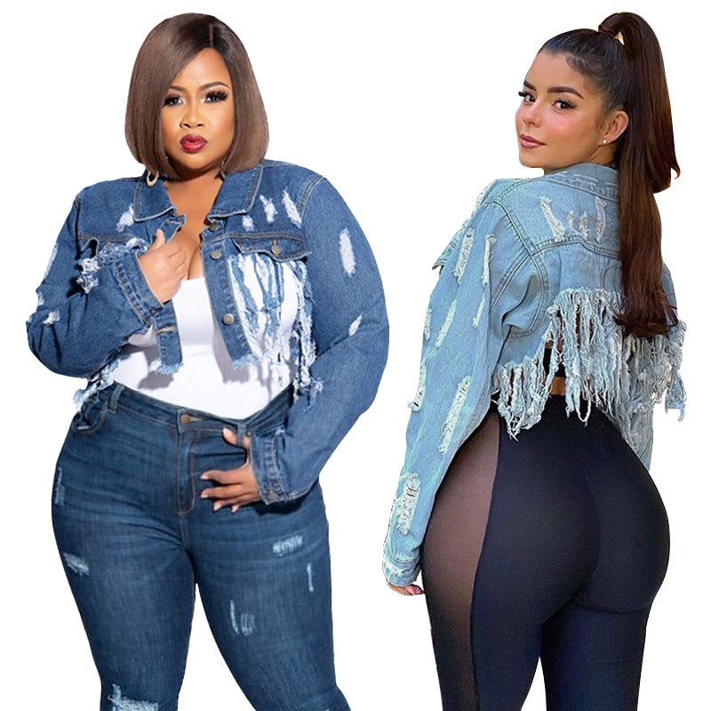 Denim Washed Tassel Ripped Long Sleeves Short Coat