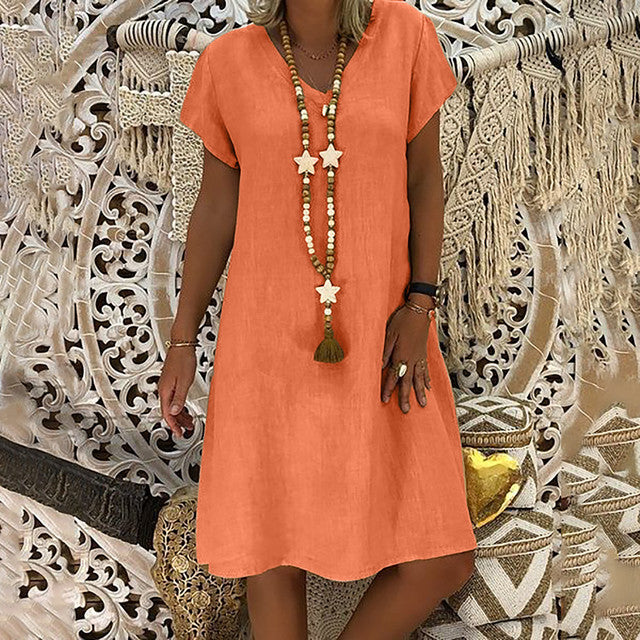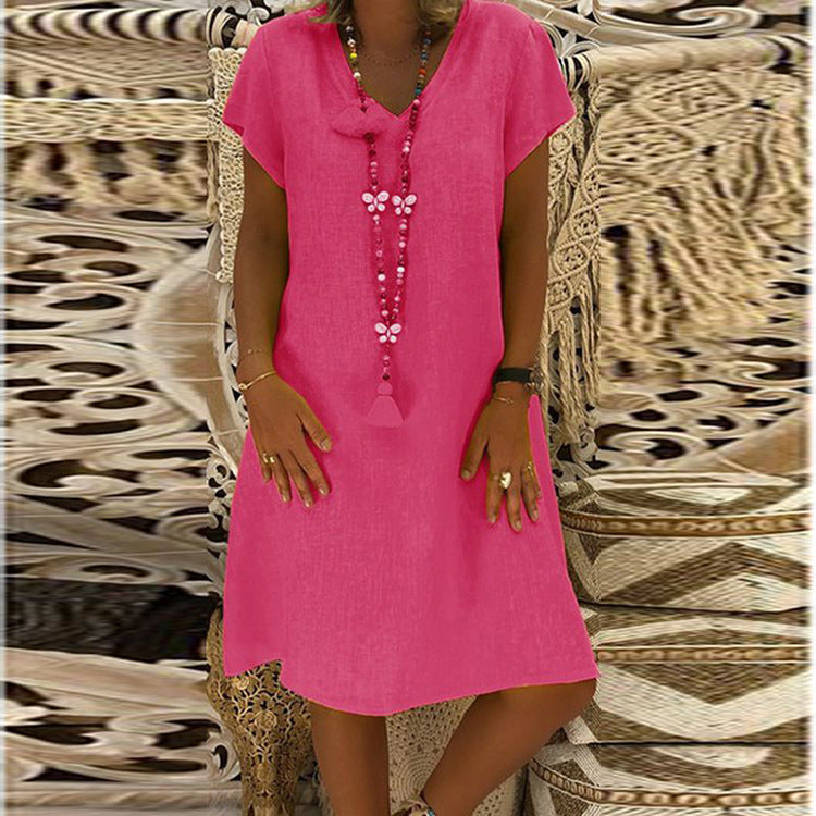 European And American Print Short-sleeved V-neck Mid-length Dress