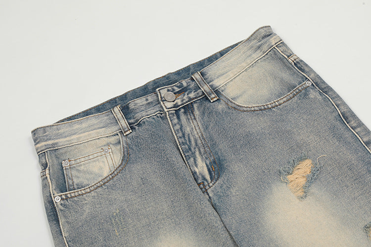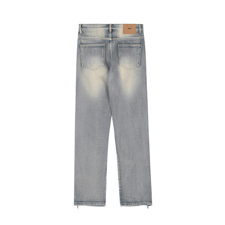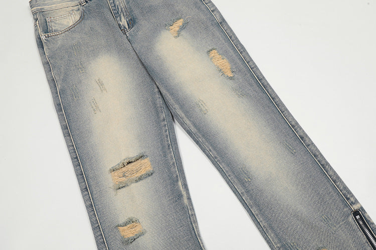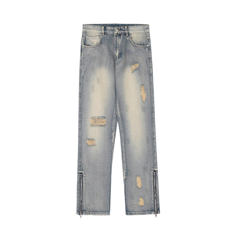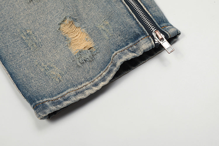 High Street Side Zipper Ripped Jeans Retro Washed Trendy Slim Fit