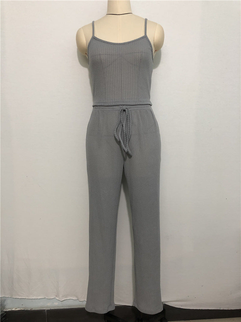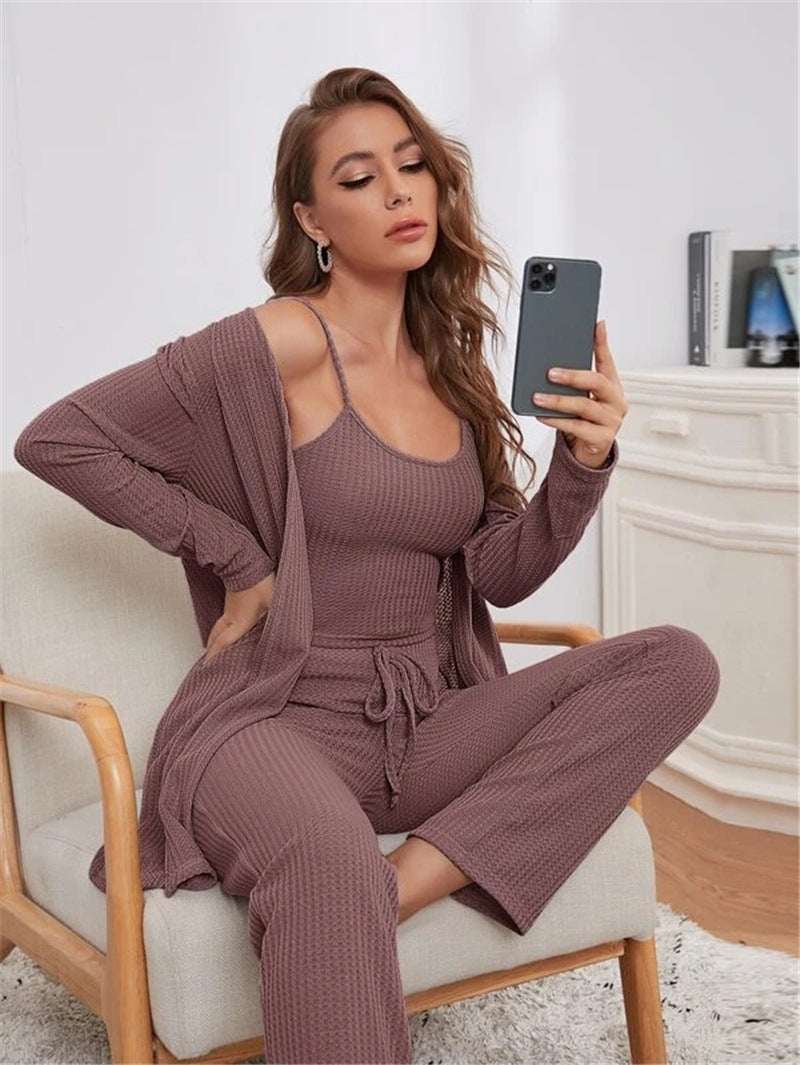 Waffle Knitted Suspenders Top And Trousers Robe Pajamas Three-piece Suit