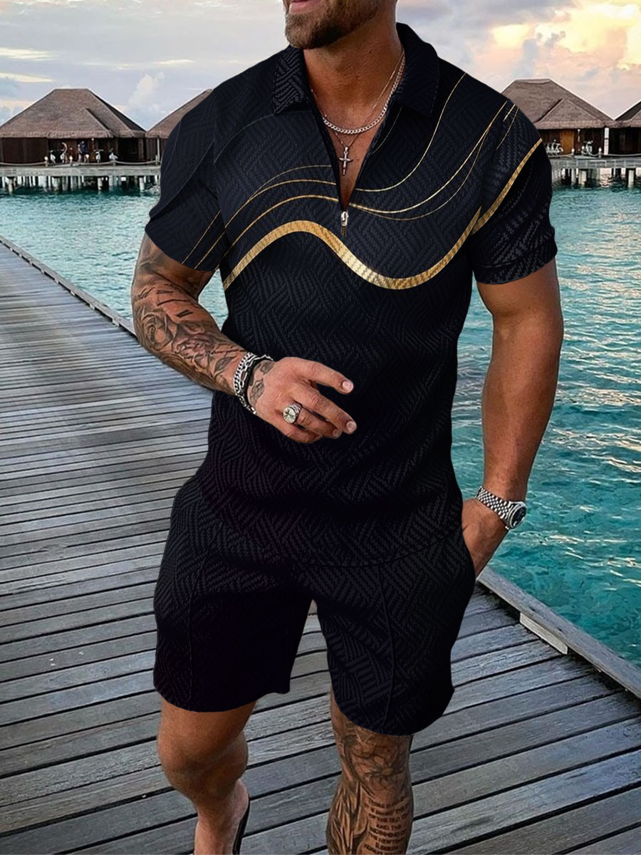 Men's 3D Printed Short Sleeve Geometric Zip Lapel Shirt Set