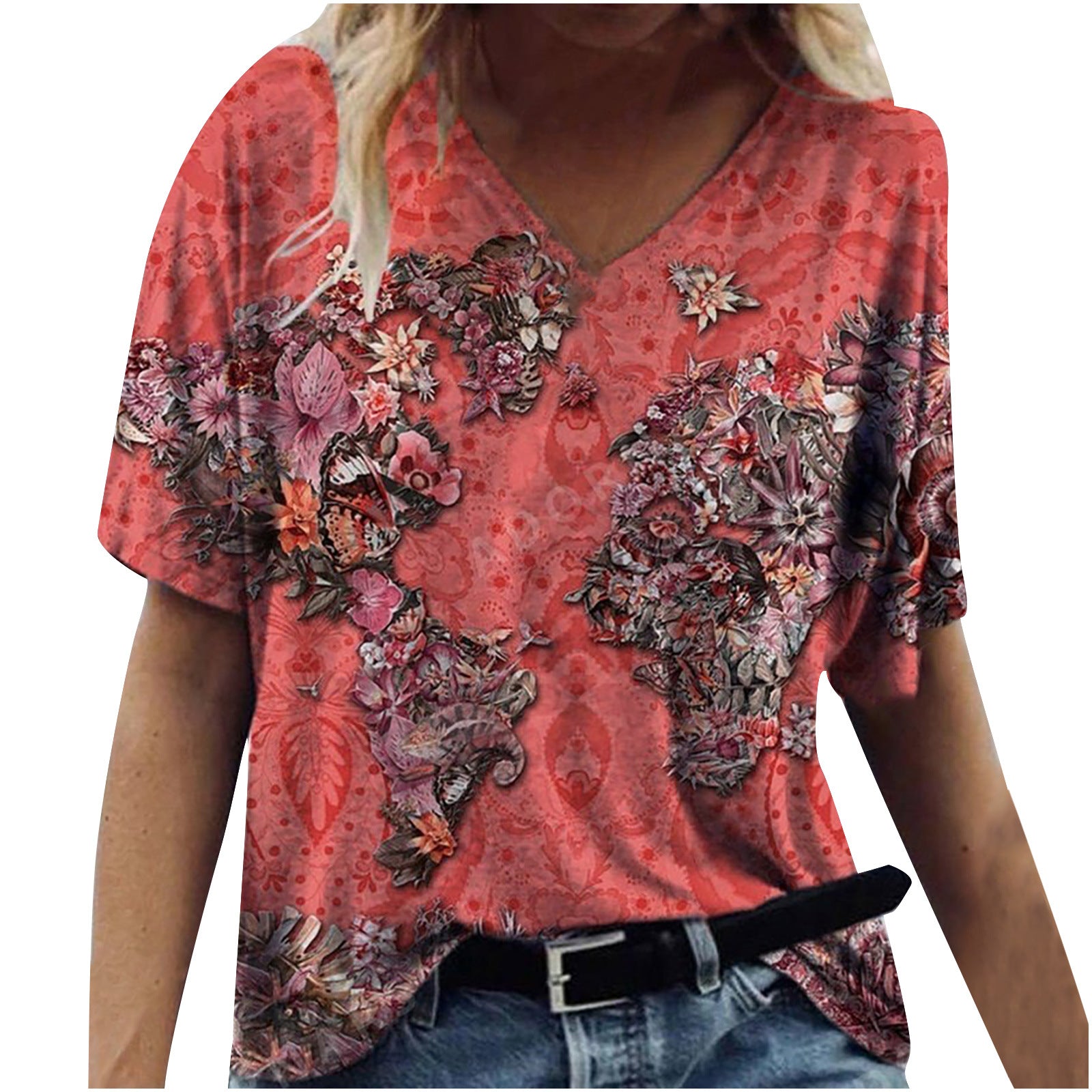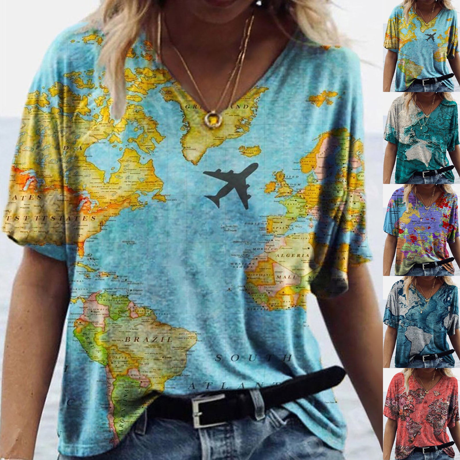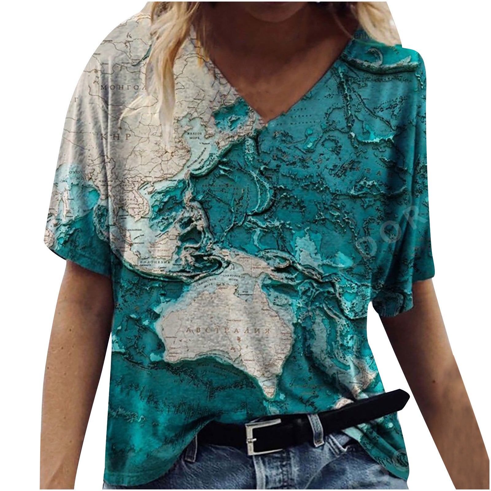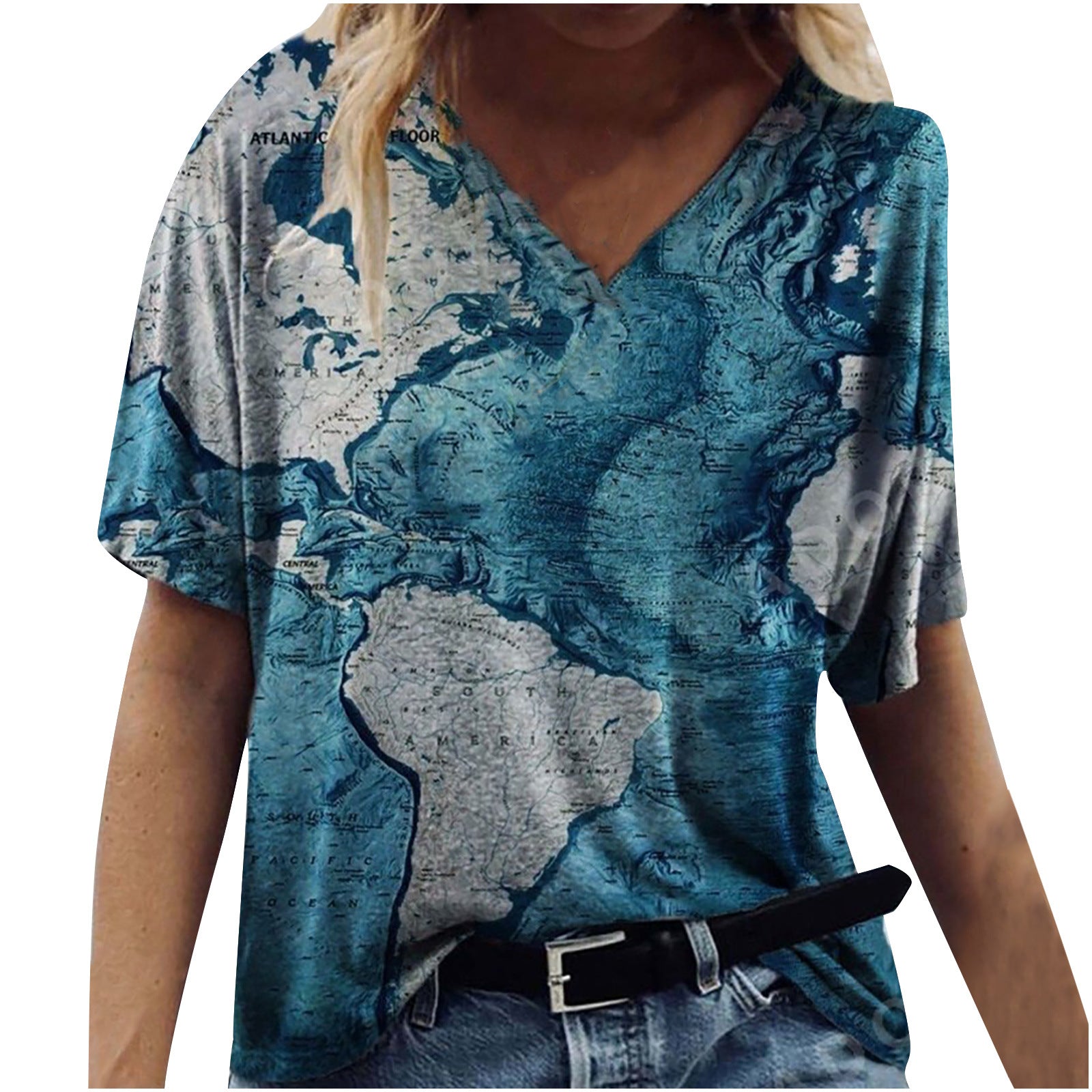 New Female Map Print V-Neck Short-Sleeved T-Shirt