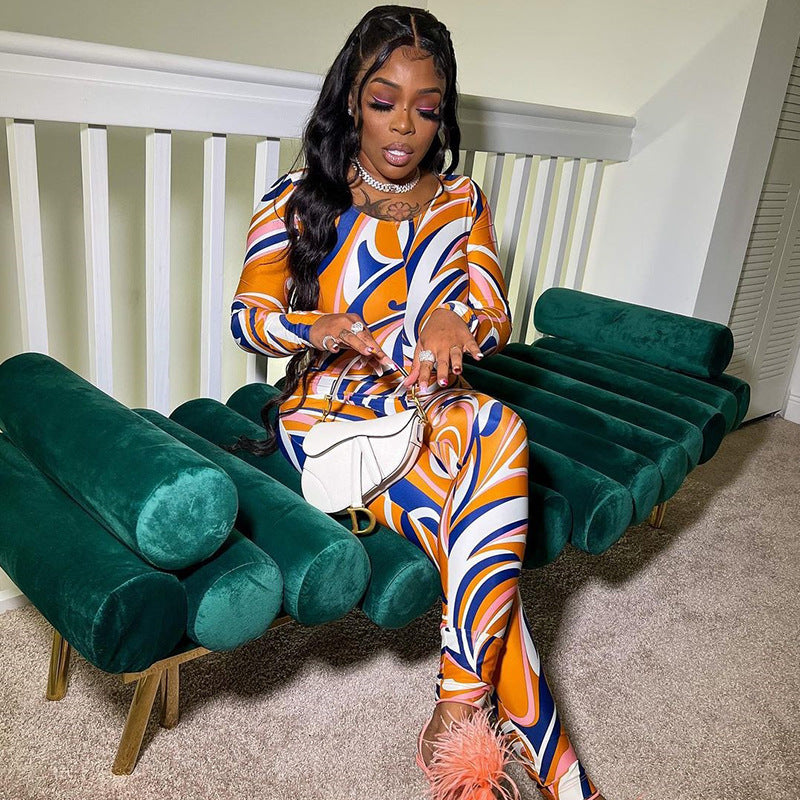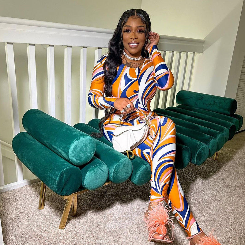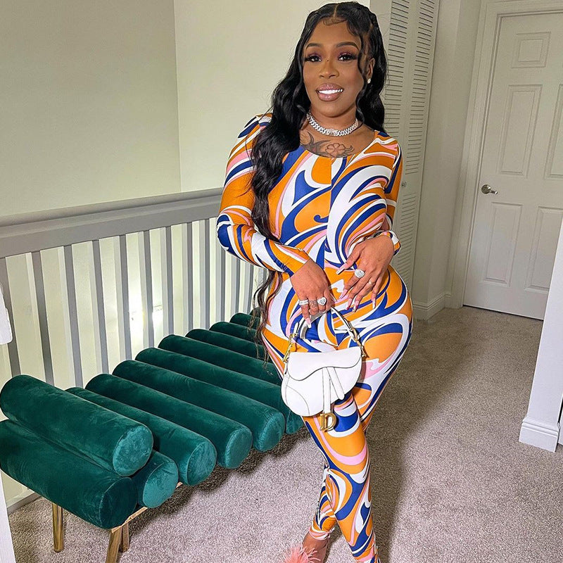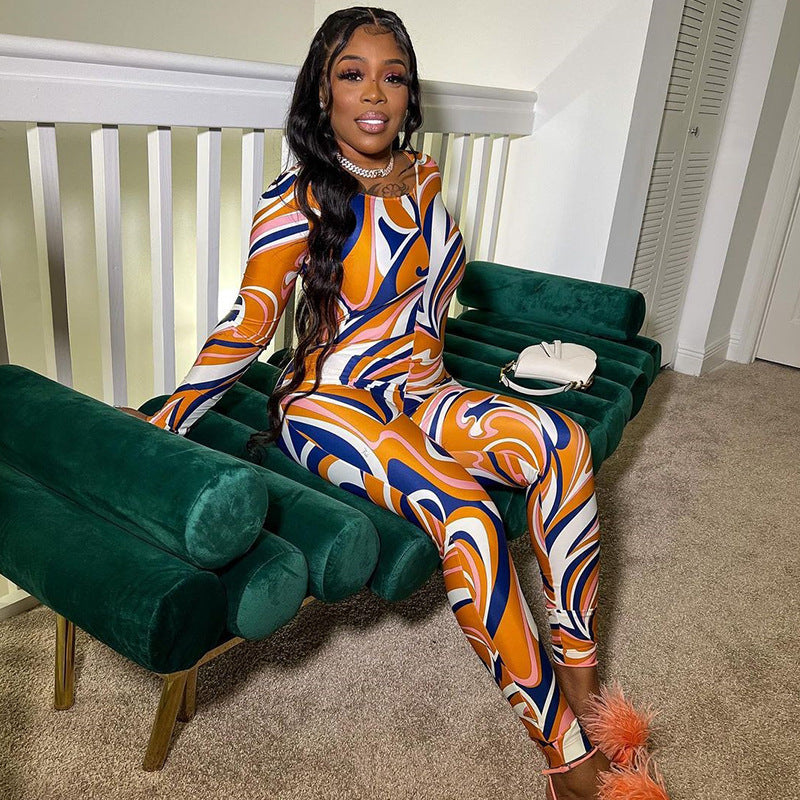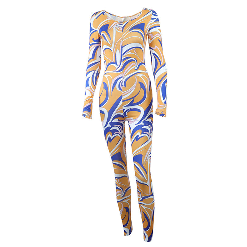 Printed Crew Neck Long Sleeve Zip-Up Sports Bodysuit