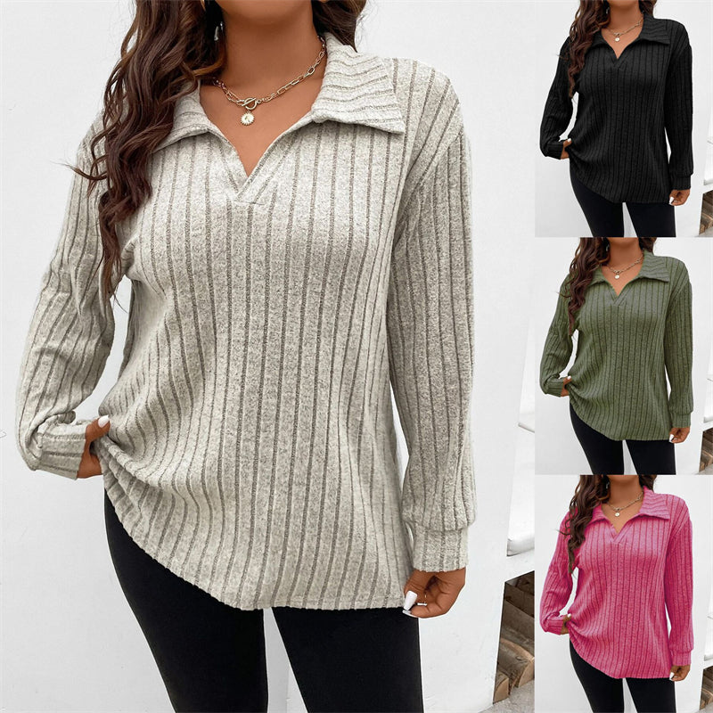 Solid Color Women's V-shaped Lapel Long Sleeve Sunken Stripe Shirt