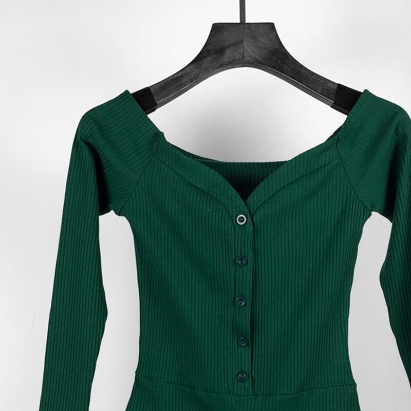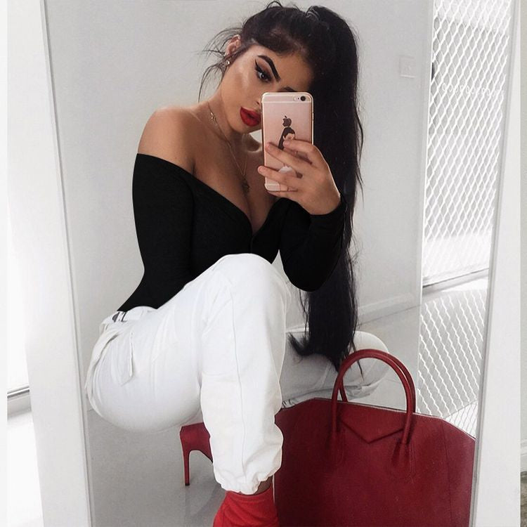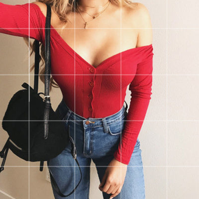 V-neck Long-Sleeved Button Jumpsuit T-shirt Blouse