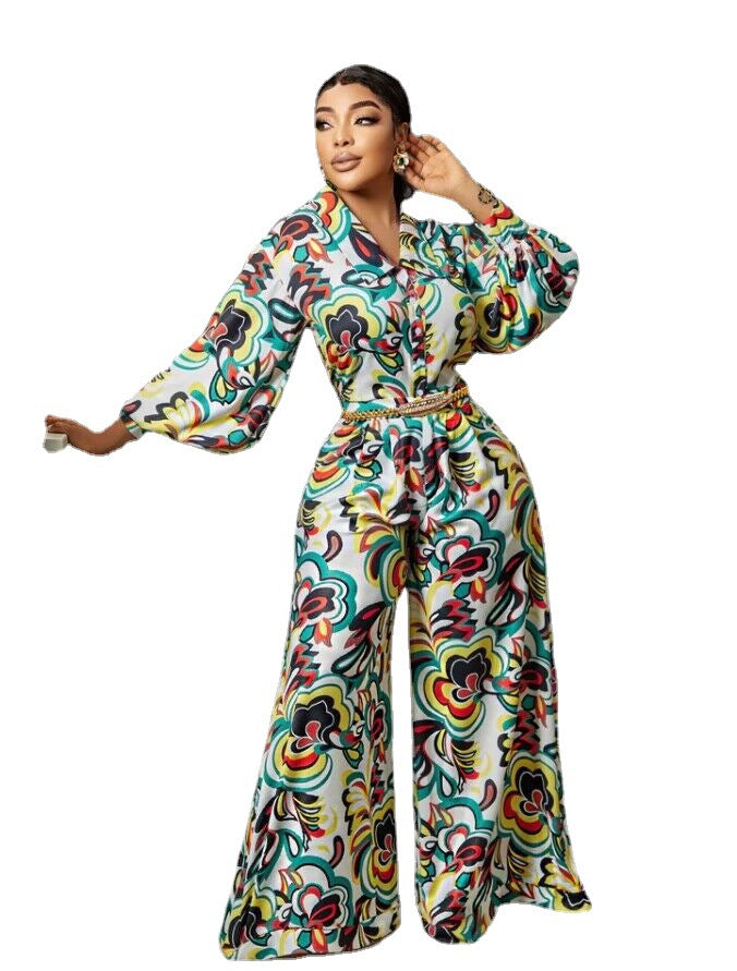 V-neck Printed High Waist Wide Leg Straight Jumpsuit