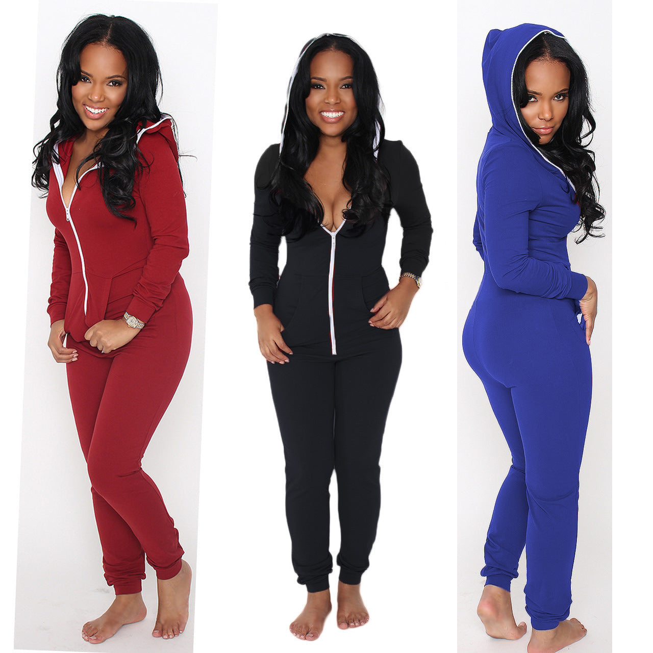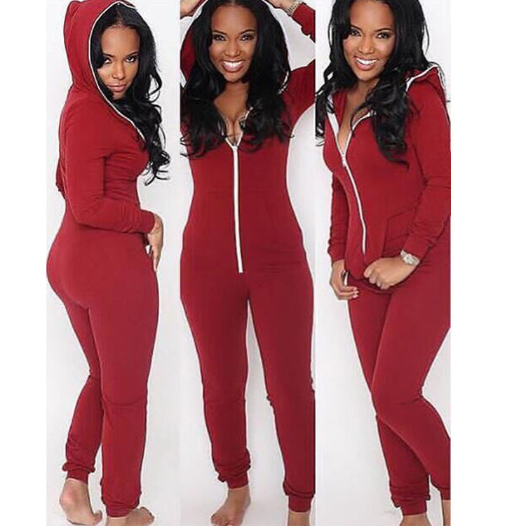 Women's Fashion Velvet Padded Hooded Zipper One-piece Trousers With Pockets
