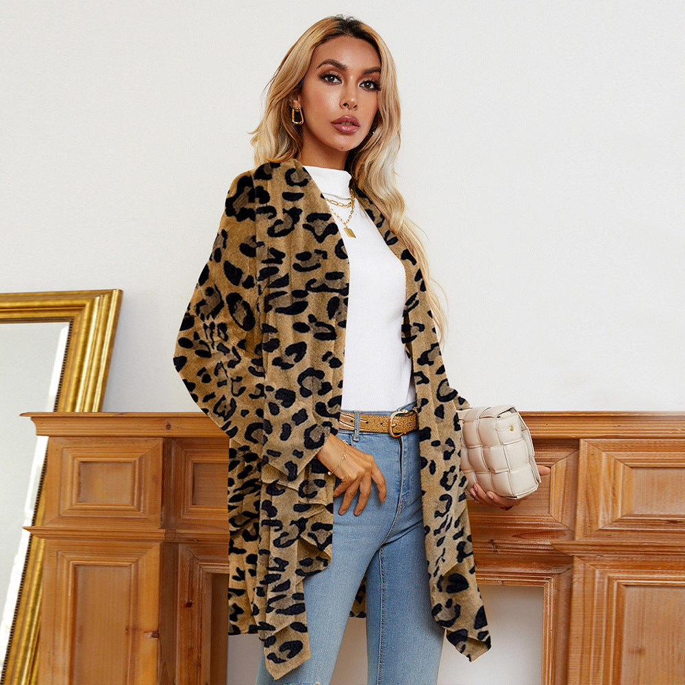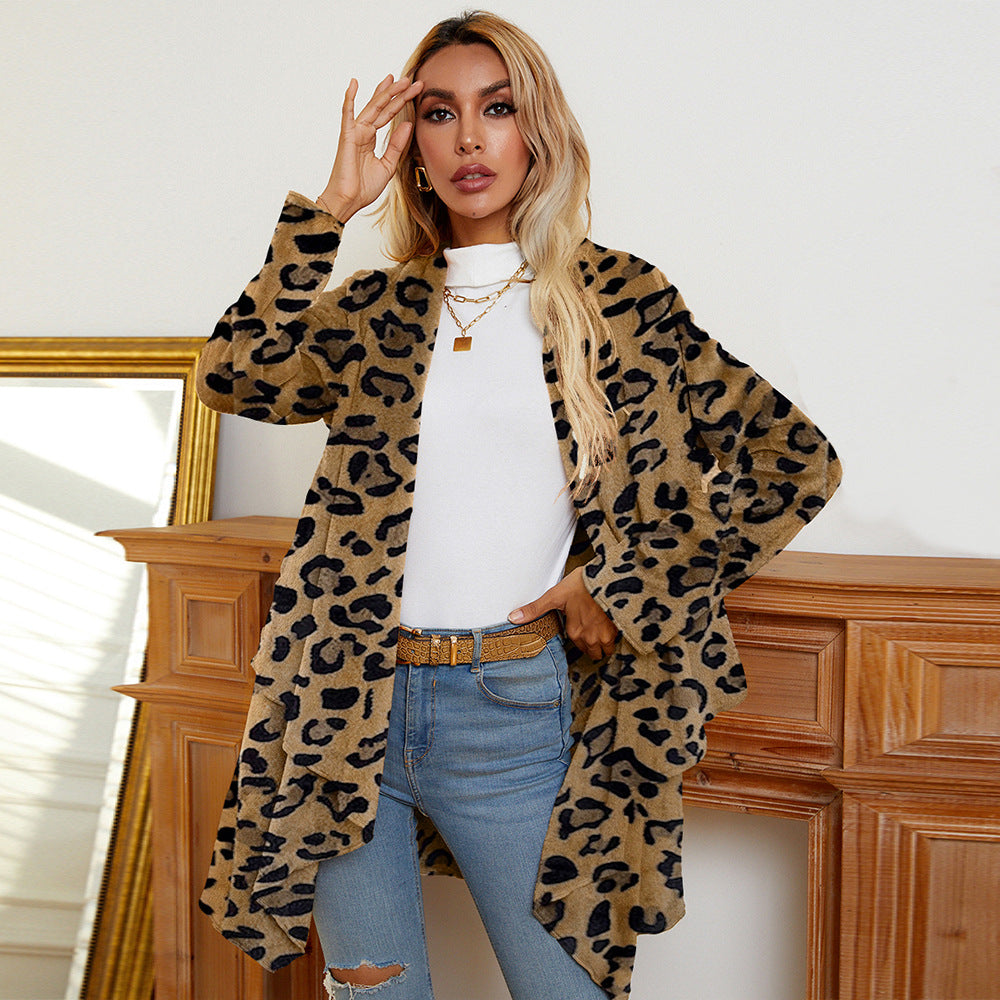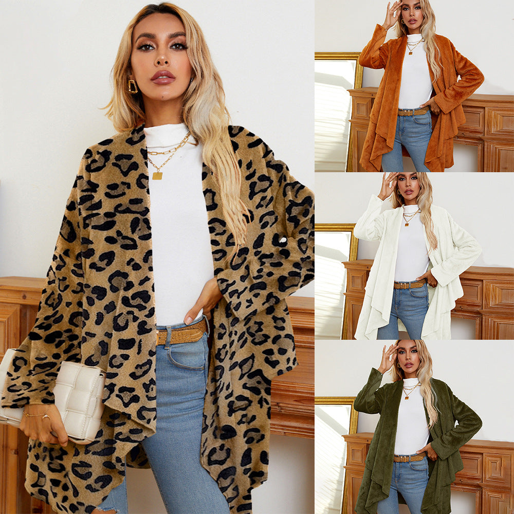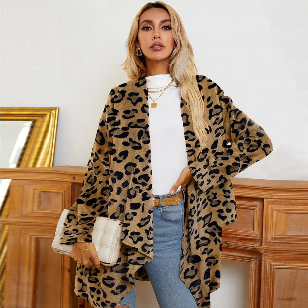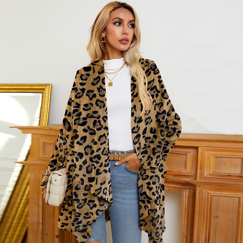 Women's Leopard Printed Irregular Hem Flannel Fashion Cardigan Coat